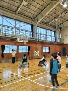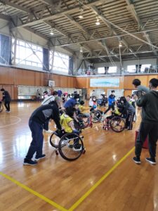 | 内容 | 講演:「障害者スポーツ 共生社会を作ろう」 競技用車いすの操作及び、車いすリレー対決 競技用車いすに乗り、シュート体験 車いすバスケットボールの試合(ツインゴール) |
